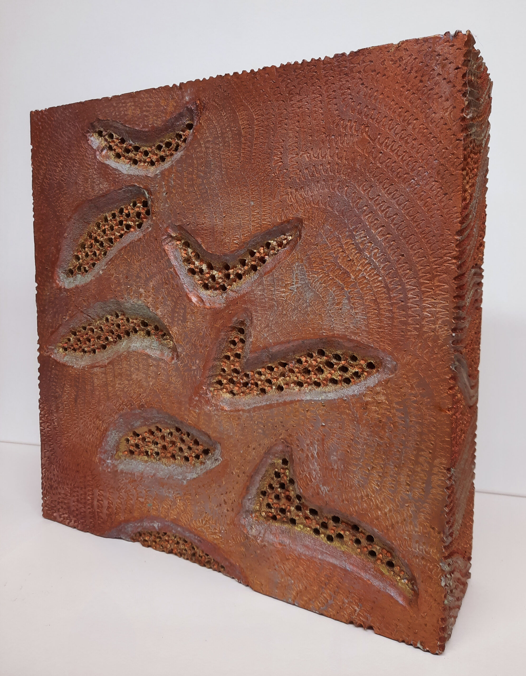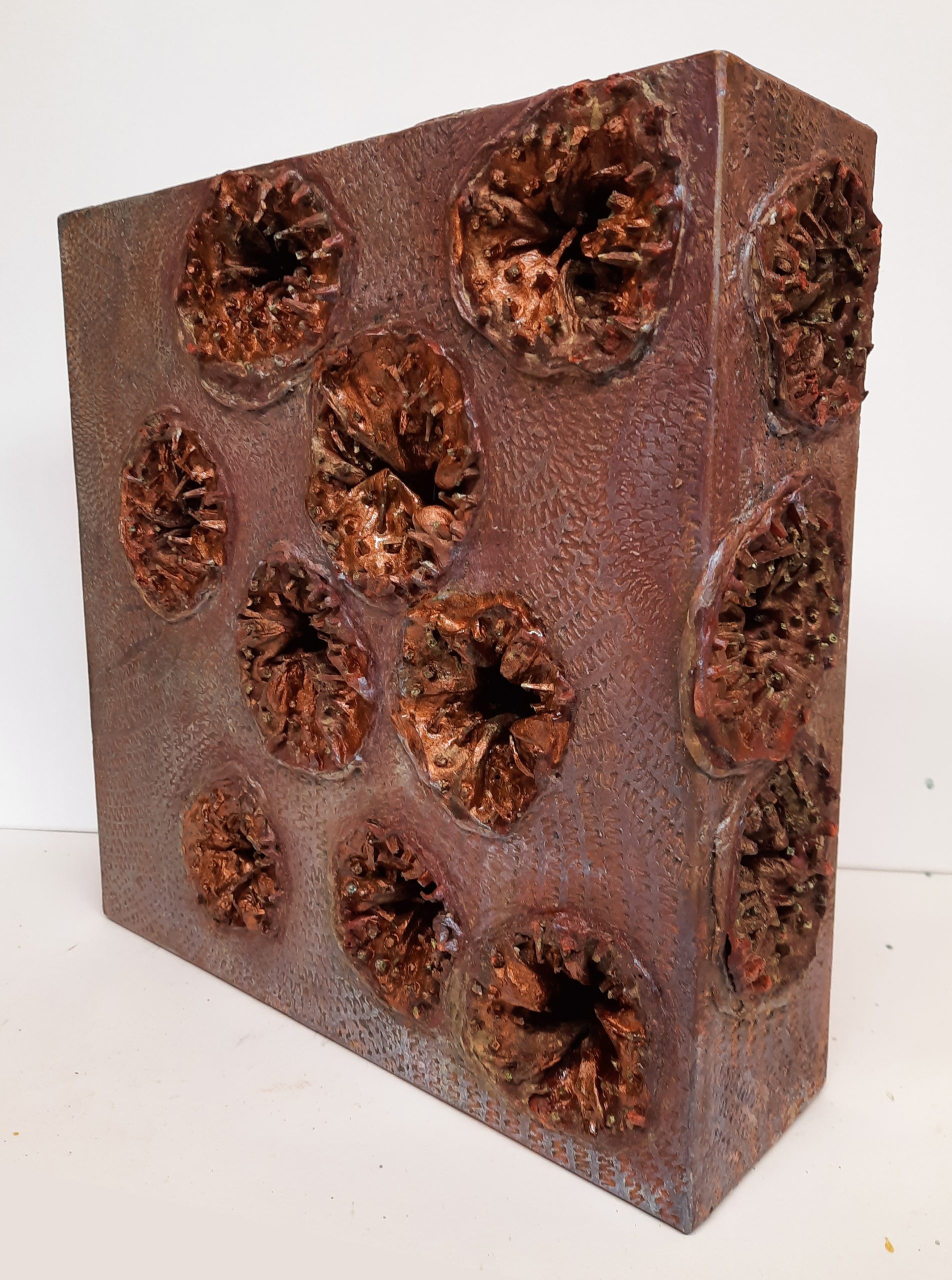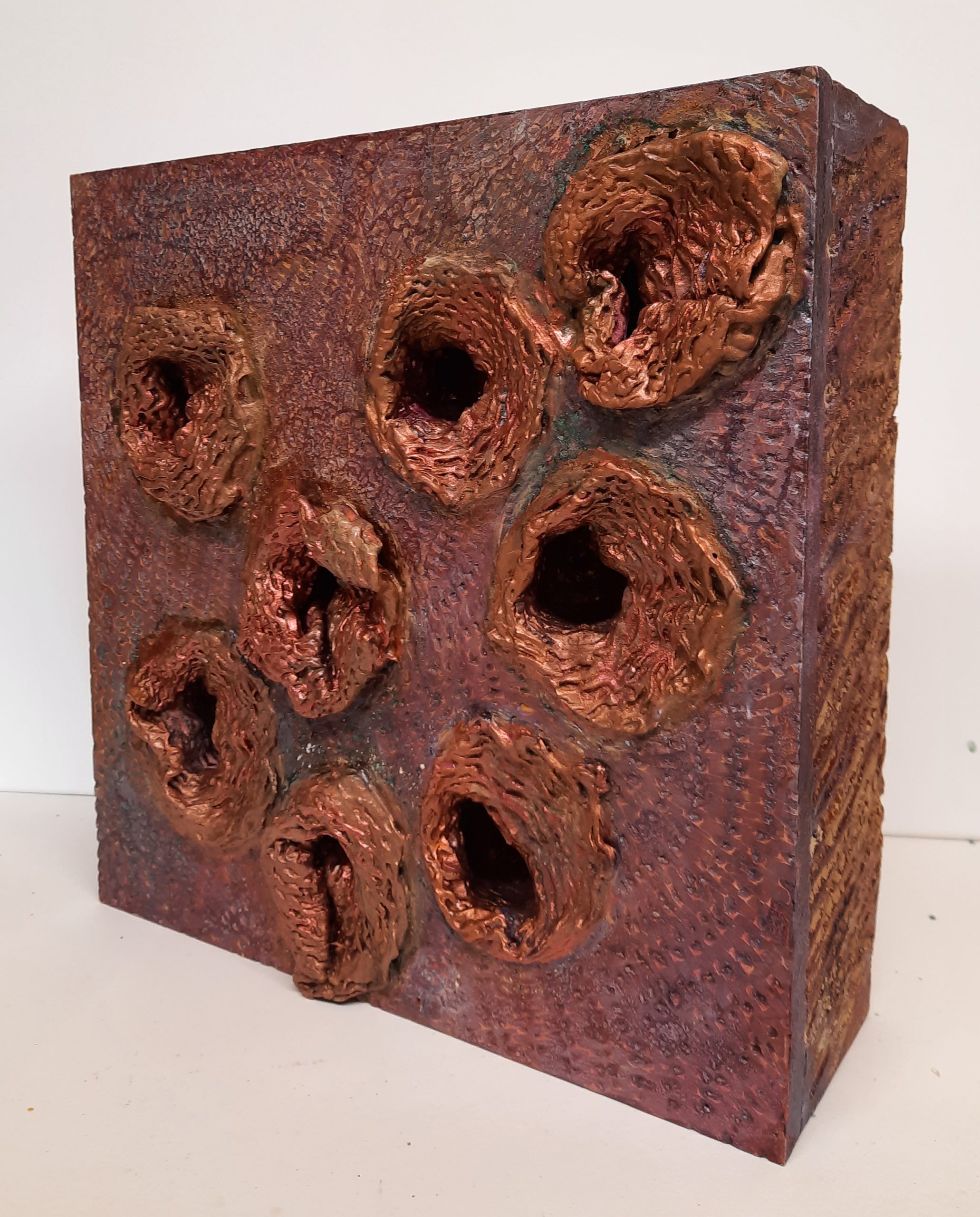 Melding ii Oil, lacquer, egg tempera and latex on carved board. 30 x 30 x 9cm 2022