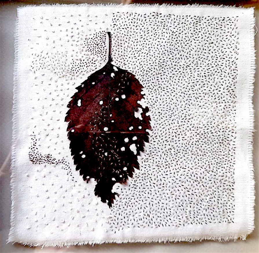 Folium 2 Decomposing dock leaves on calico, with stitch added. 35 x 35 cm 2021